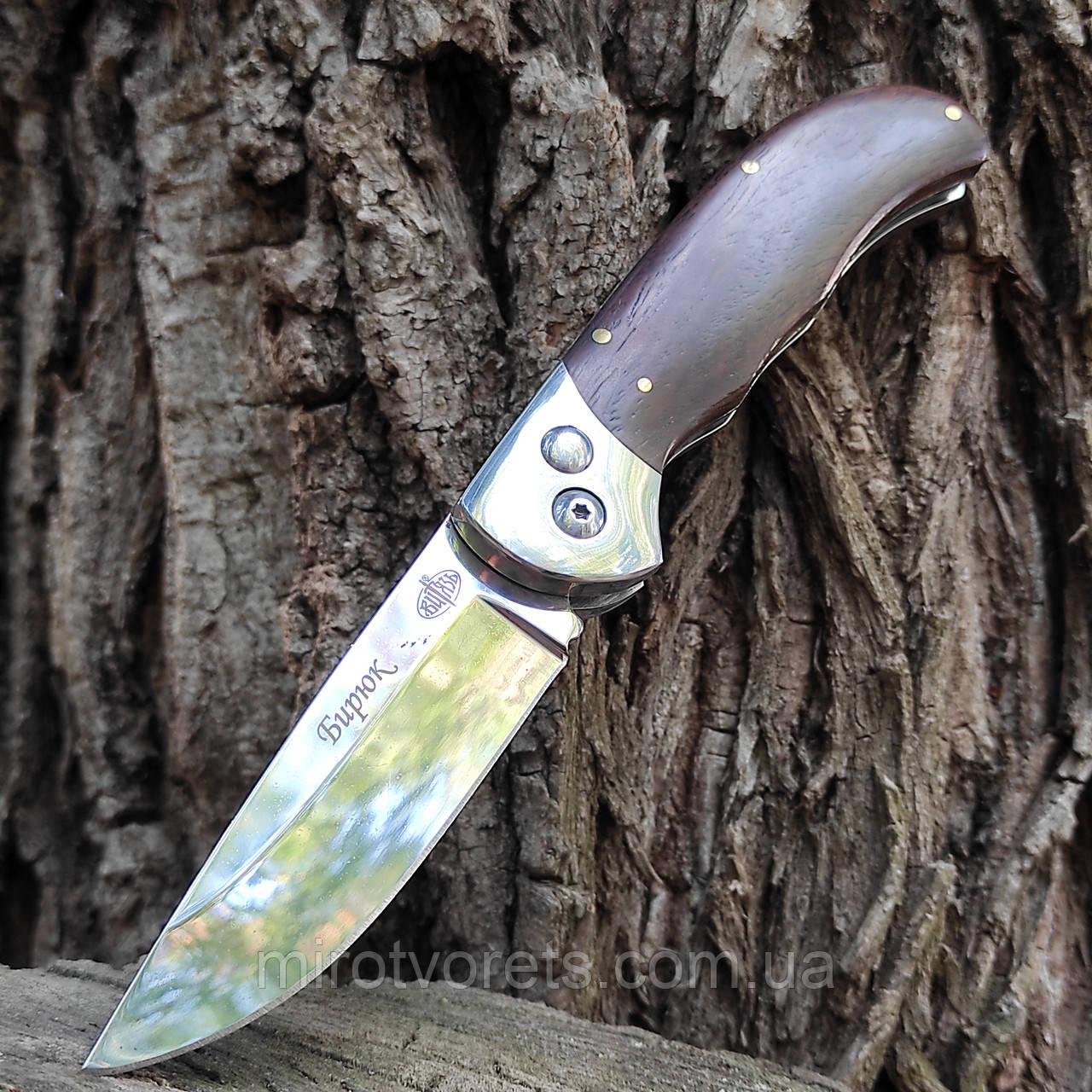 Ніж складний, автоматичний Бірюк від виробника «Витязь» виготовлені з високоякісних матеріалів. Відмінний помічник в поході, так само для риболовлі, туризму, полювання та ін Клинок ножа виготовлений з нержавіючої 65Х13 сталі. Рукояті виготовлена з дерева. Ніж має просту конструкцію, він міцний, надійний і безпечний. Фіксація клинка у відкритому положенні здійснюється надійним замком Plunge Lock. Відкривається при натисканні на кнопку, за допомогою потужної пружини. Відмінний варіант для подарунка.