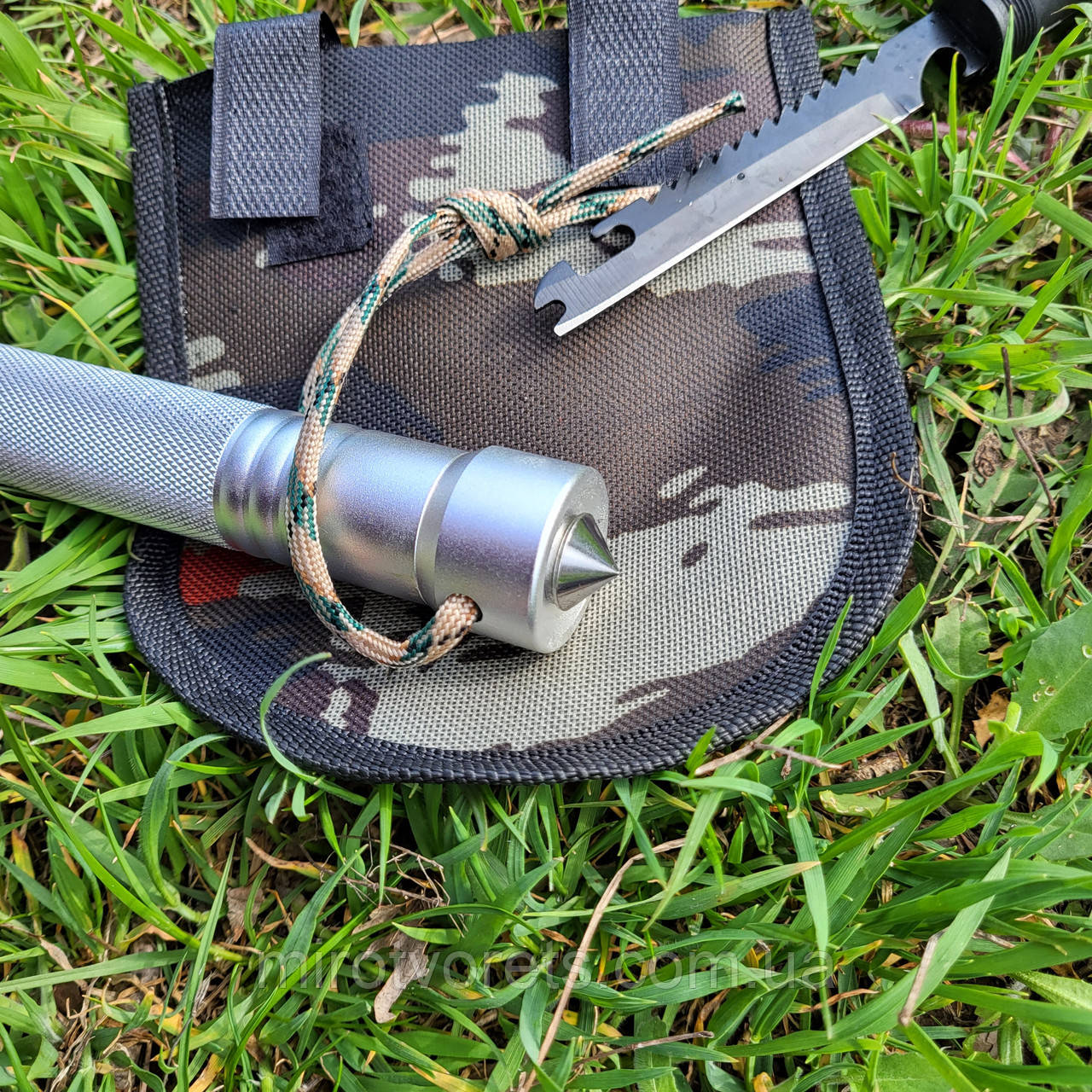 Багатофункціональна складана лопатка просто незамінна річ у будь-якому поході. Крім стандартної функції копати, лопатою можна рубати, пиляти невеликі гілки. Складана під кутом 90 градусів лопата виконує функцію кирки або мотики. Кінець лопати зроблений як склобій і має вбудоване кресало огниво, , яку можна замінити на викрутку (плоску, хрестову) або на ніж із пилкою та відкривачкою. Сама лопата має ще три спеціальні отвори для відкручування гайок.