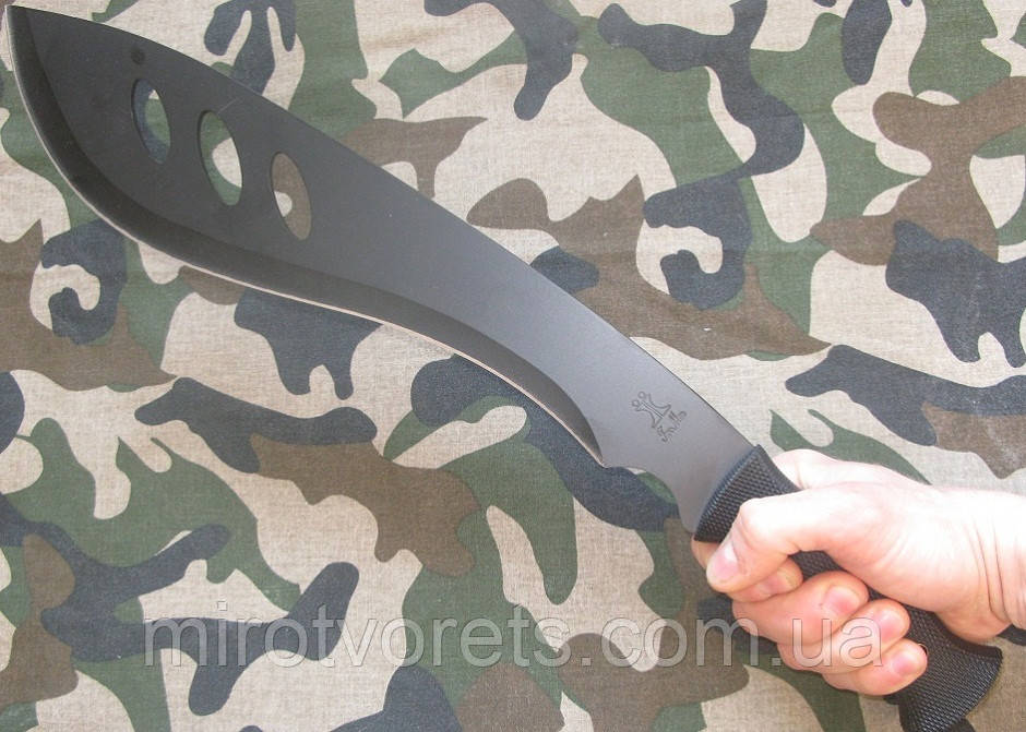 Мачете Wild Wolf середніх розмірів, чорний. Клинок полегшений завдяки отвору в клинку. Гумова ручка комфортно "сидить" у руці.